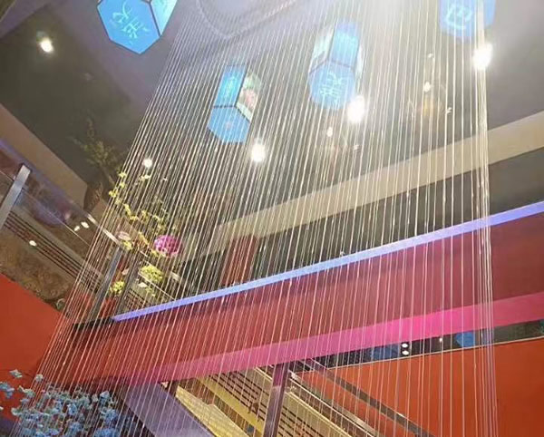 水簾噴泉是水體沿著特殊的線流動,由于水孔較細(xì)小、單薄,流下時仿若水的簾幕,構(gòu)成了無聲的閃爍水幕,而流水不會噴灑到四周,并使空氣變濕潤,可以在室內(nèi)起到觀賞、間隔空間、配合室內(nèi)設(shè)計的作用,水簾通過人工對水流的控制達(dá)到藝術(shù)效果,滿足人的親水要求。